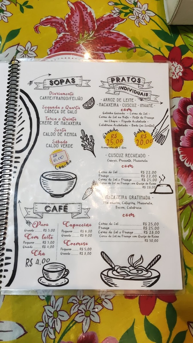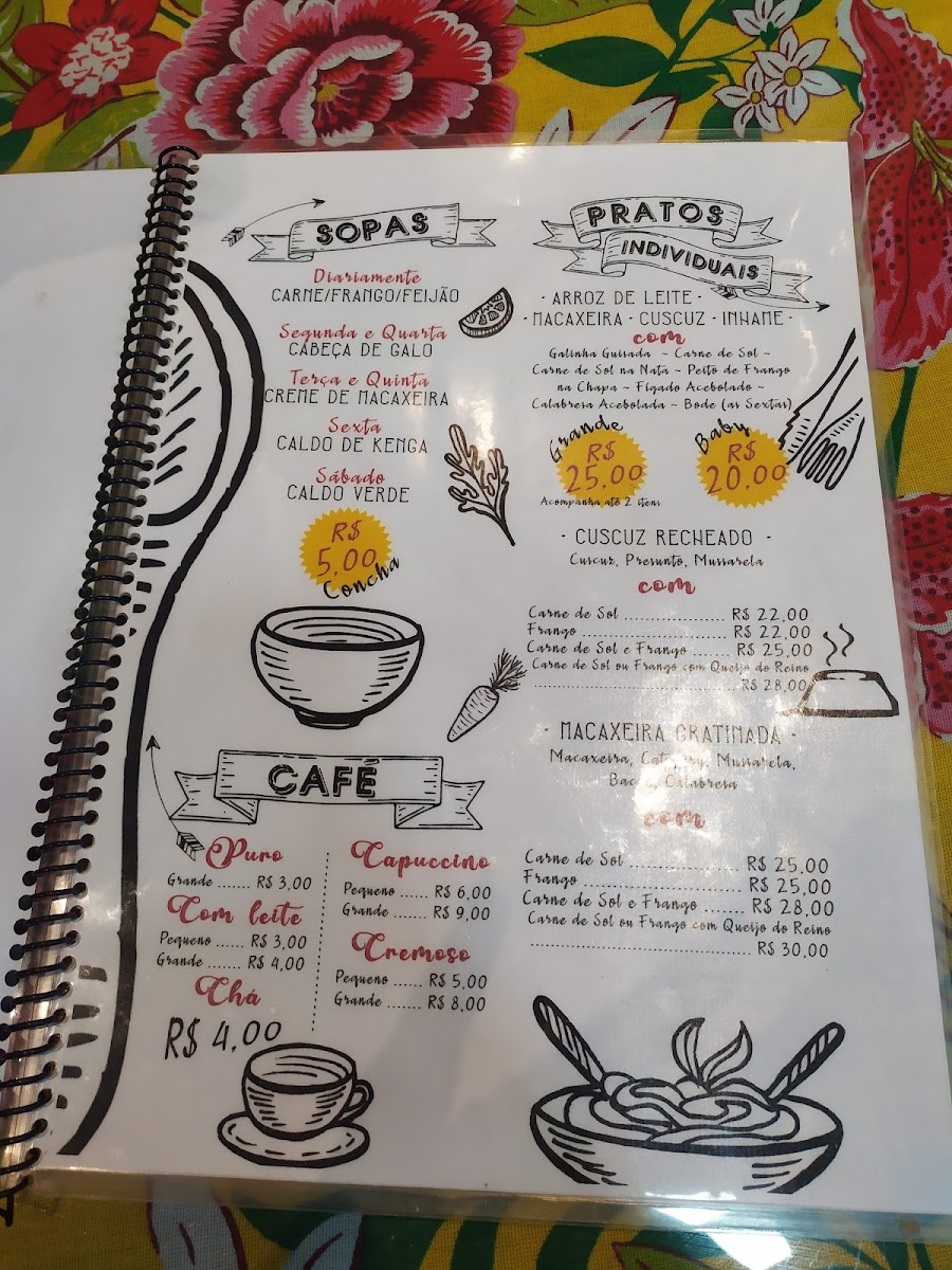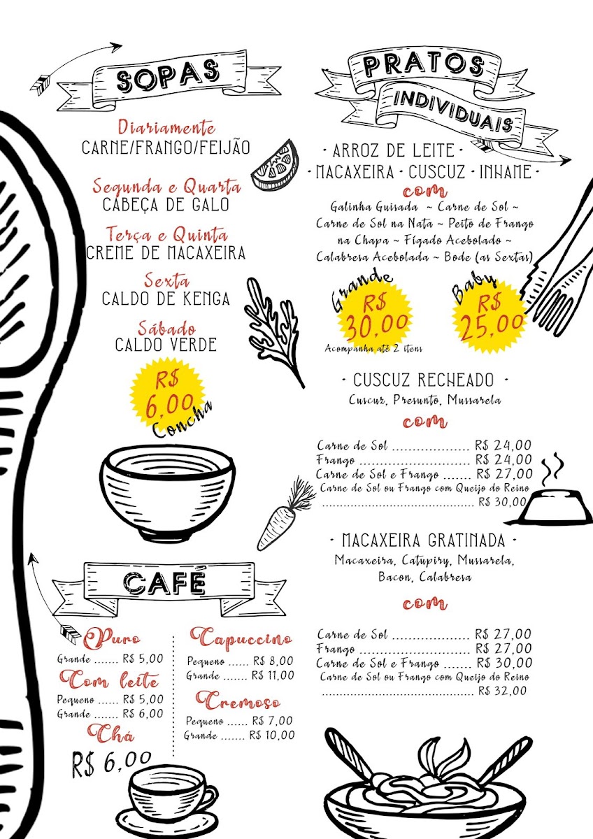 Diariamente: Feijão, Carne e Frango; Pratos do Dia: Segundas e Quartas - Cabeça de Galo; Terças e Quintas - Creme de Macaxeira; Sextas - Caldo de Kenga.