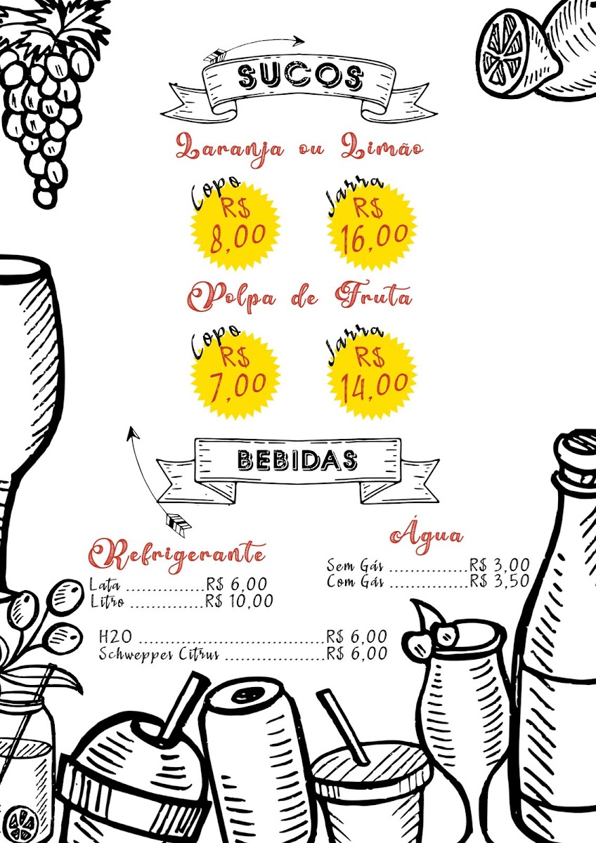 Polpa - Copo R$ 7,00, Jarra R$ 14,00 / Laranja ou Limão - R$ 8,00, Jarra: R$ 16,00