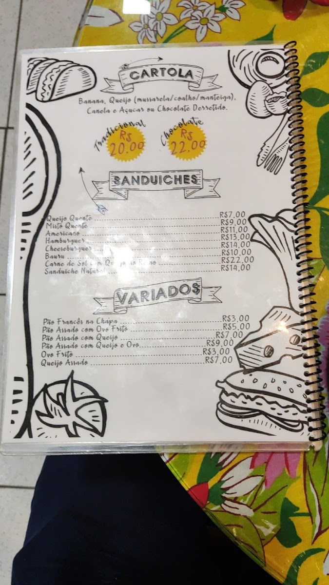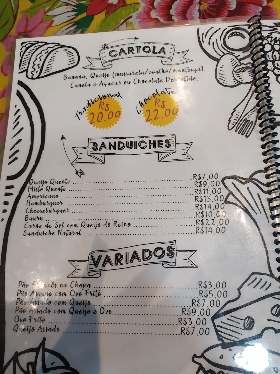 Pão com ovo: R$ 6,00; Pão na chapa: R$ 4,00; Pão com queijo coalho: R$ 9,00; Fatia de queijo: 9,00; Ovo frito: R$ 4,00; Cartola tradicional: R$ 22,00; e Cartola com chocolate: R$ 24,00.