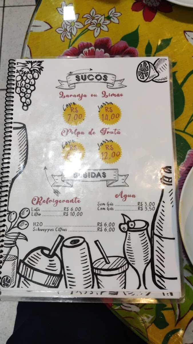 Refrigerante: Lata - R$ 6,00 / 1 litro - R$ 10,00; H2O - R$ 6,00; Água Mineral 500 ml sem gás - R$ 3,00; Água mineral 500ml com gás - R$ 3,50.